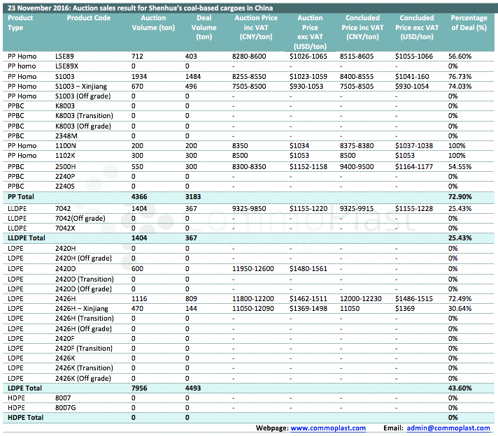 23 November 2016: Auction sales result for Shenhua's coal-based cargoes in China