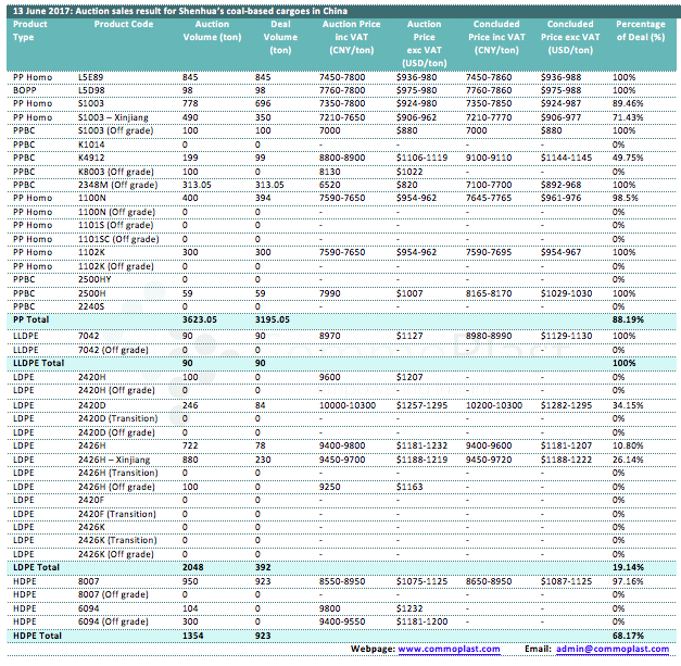 13 June 2017: Auction sales result for Shenhua's coal-based cargoes in China