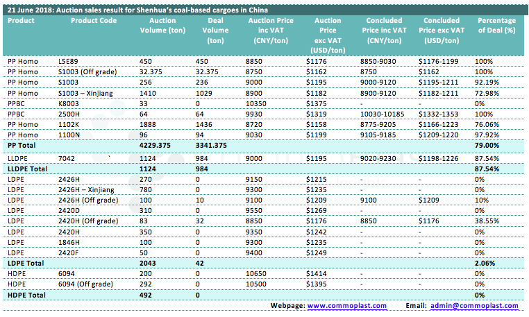 21 June 2018: Auction sales result for Shenhua's coal-based cargoes in China