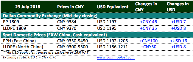 Dalian Commodity Exchange retains its strength throughout the first trading hours on a fresh week. Both PP and LLDPE contracts for September delivery inched slightly higher before the break-time.