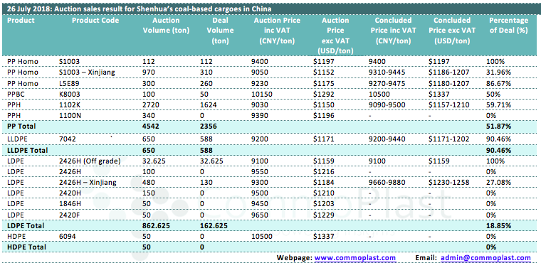 26 July 2018: Auction sales result for Shenhua's coal-based cargoes in China