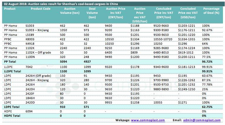 Auctions sales result for Shenhua’s coal-based polyolefin products in domestic China are as following: